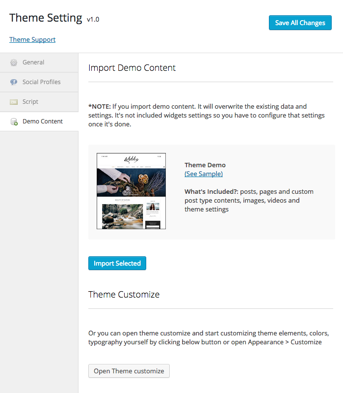 For WordPress beginner. It might not be easy to start setting up site so we provide import functionality to theme. You can import all demo contents in just single click, it’s not only demo contents are imported but also customisation settings as well